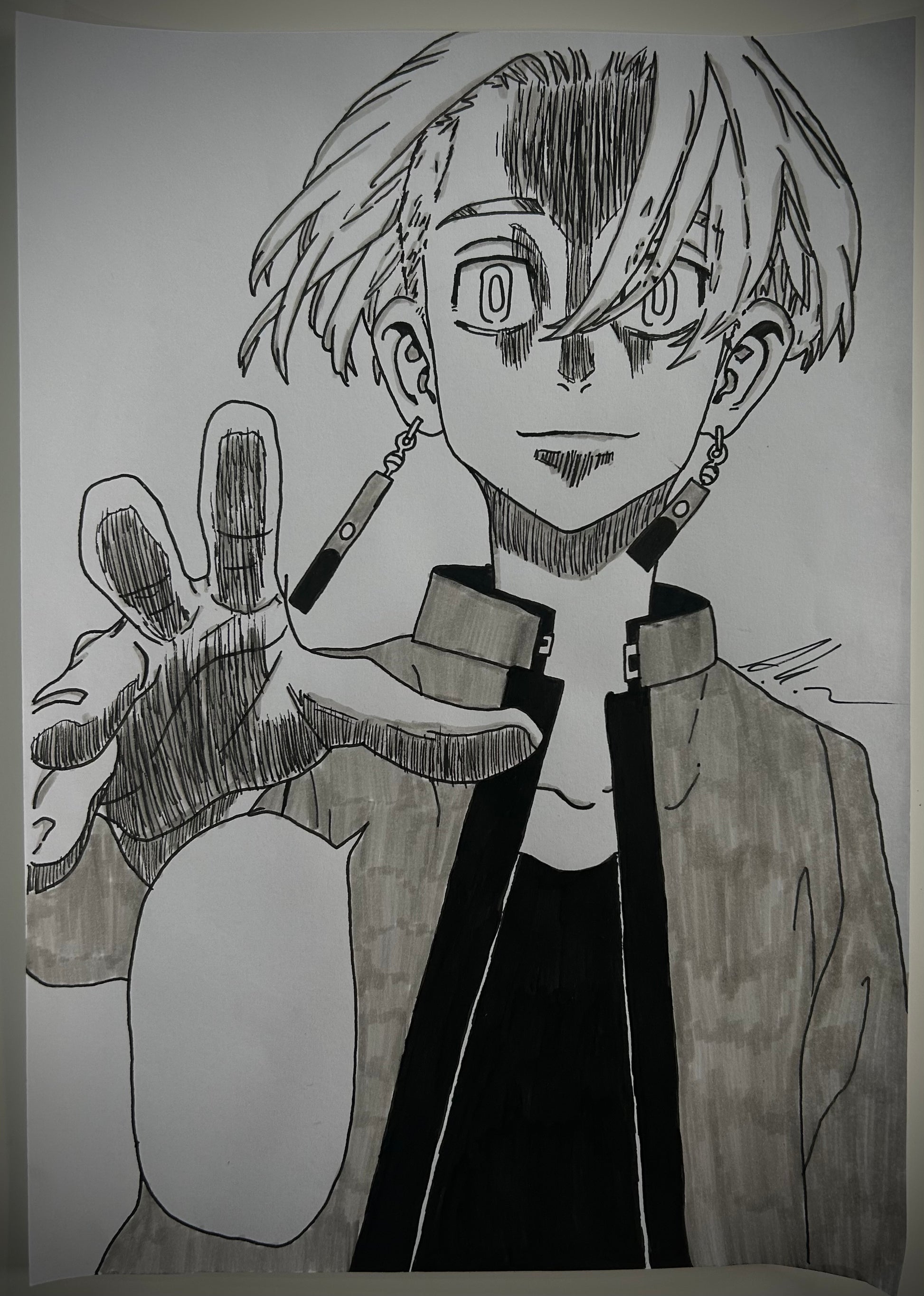 Das Motiv zeigt eine Figur im Manga-Stil mit starkem Ausdruck und detaillierter Schattierung. Die Linienführung ist bewusst dynamisch und kontrastreich gehalten.