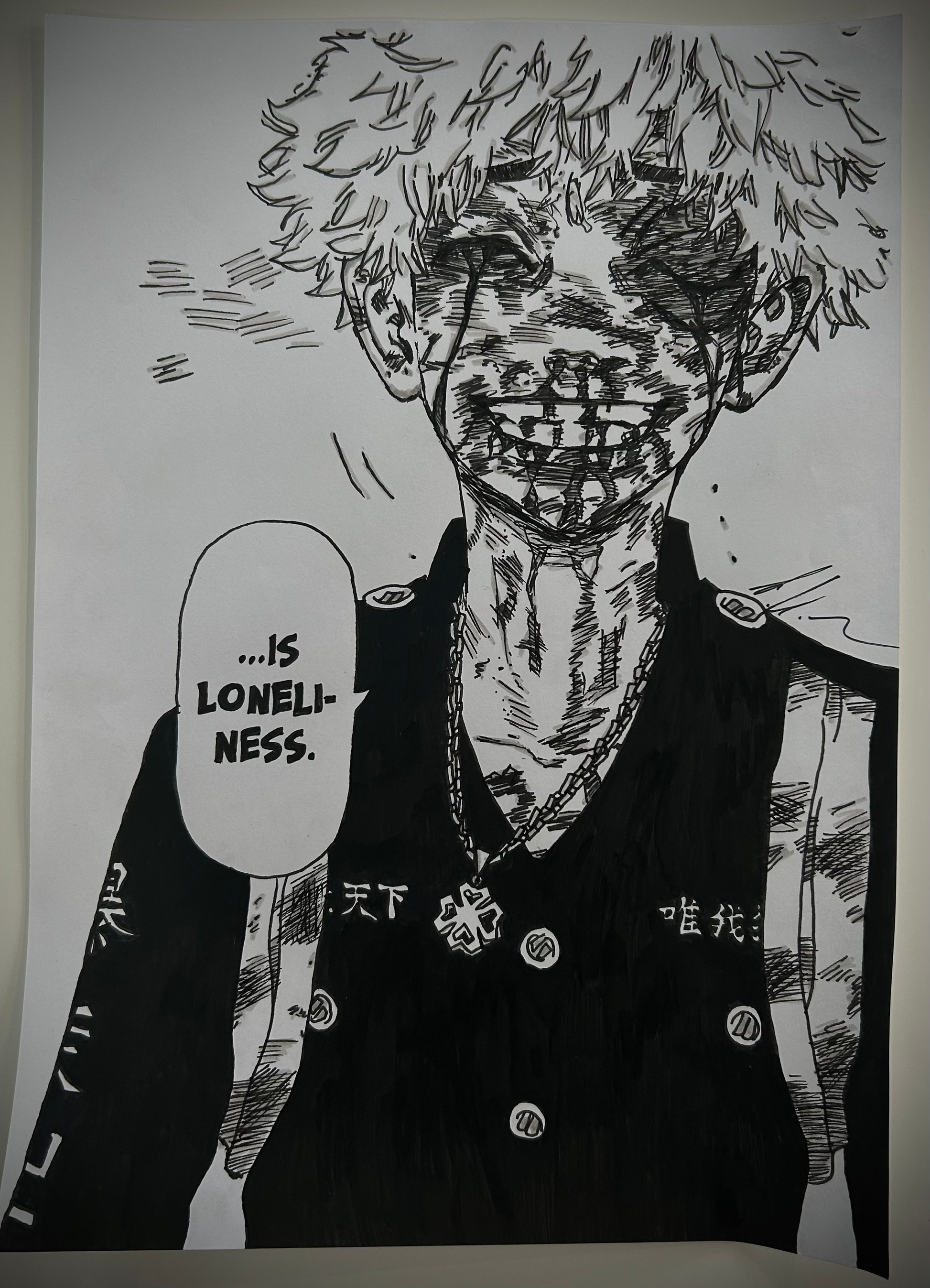 Das Motiv zeigt eine Figur im Manga-Stil mit starkem Ausdruck und detaillierter Schattierung. Die Linienführung ist bewusst dynamisch und kontrastreich gehalten.
